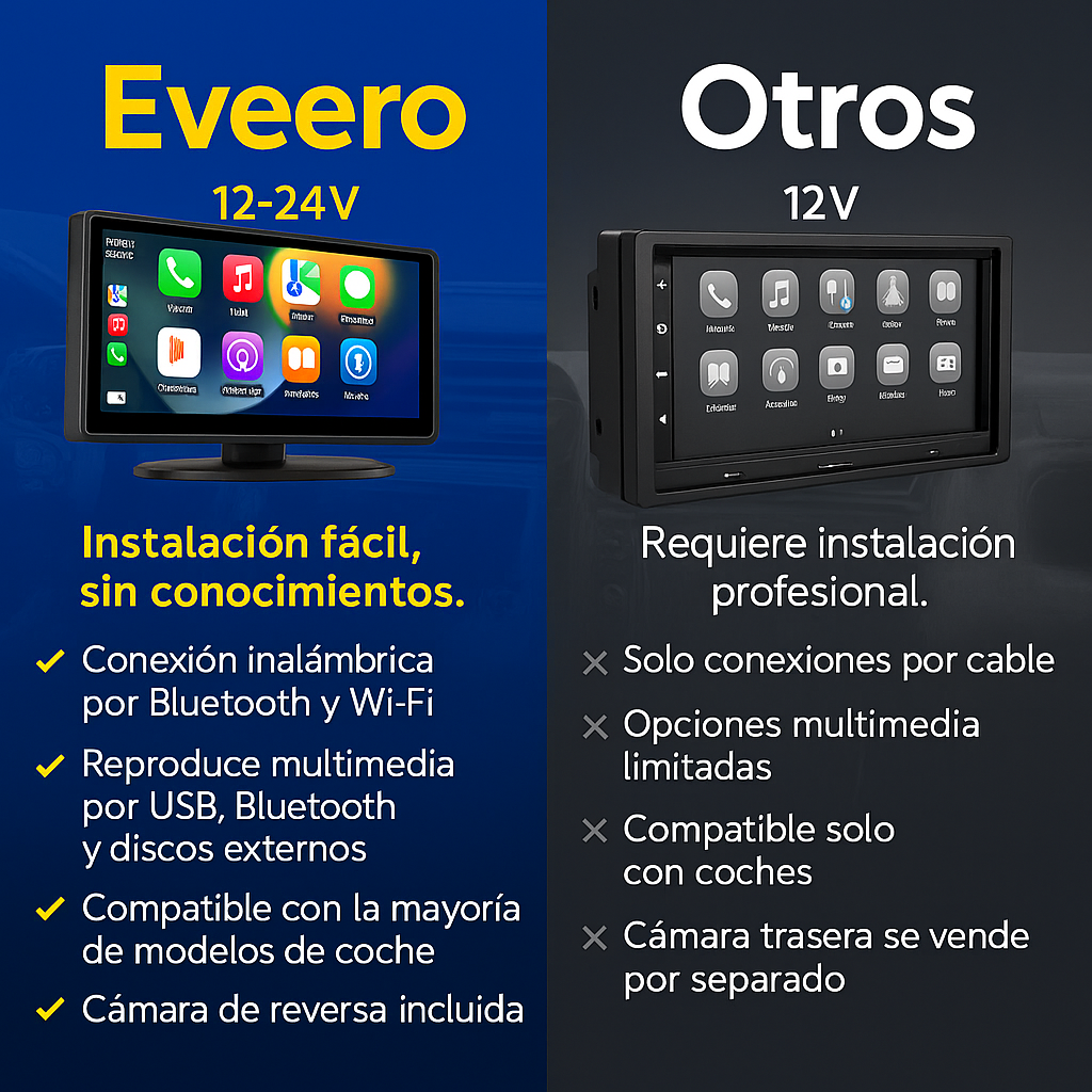 La Pantalla EVEERO transforma tu coche en un vehículo inteligente con Apple CarPlay y Android Auto inalámbricos, una pantalla HD de 7 pulgadas, instalación en menos de 5 minutos y control por voz con Siri o Google Assistant. ¡Aprovecha la oferta de $64 hoy!